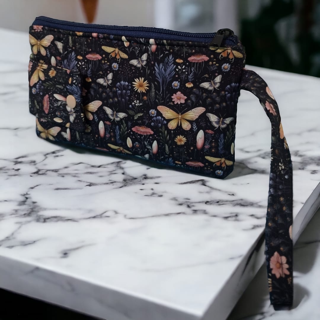 Carteira porta celular em tecido tricoline 100% algodão, forro em TNT e fechamento em zíper. Um bolso externo para acoplar o celular e fechamento com lapela e botão tic tac.